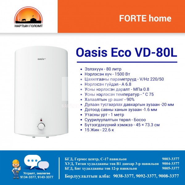 ОХУ-ын Forte home үйлдвэрийн Oasis eco загварын эзлэхүүний халуун ус халаагч шинээр буулаа. 30л, 50л, 80л, 100л гэсэн сонголттой тул танай гэр болон байгууллагын хэрэглээниий халуун усыг бүрэн шийднэ.